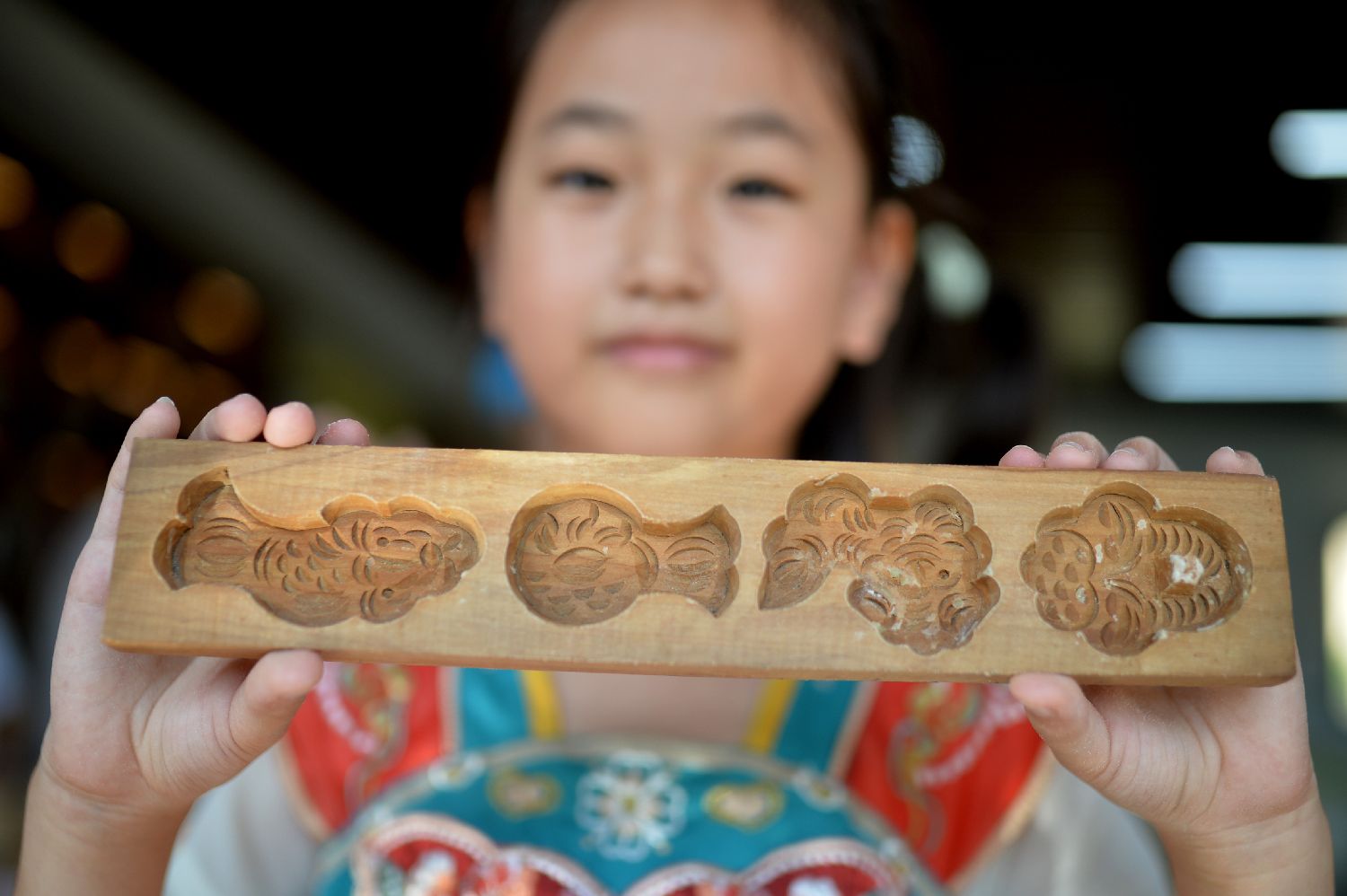 8月26日,在山东省青岛市城阳区河套街道西河套社区,小朋友展示制作七夕巧果的模具。