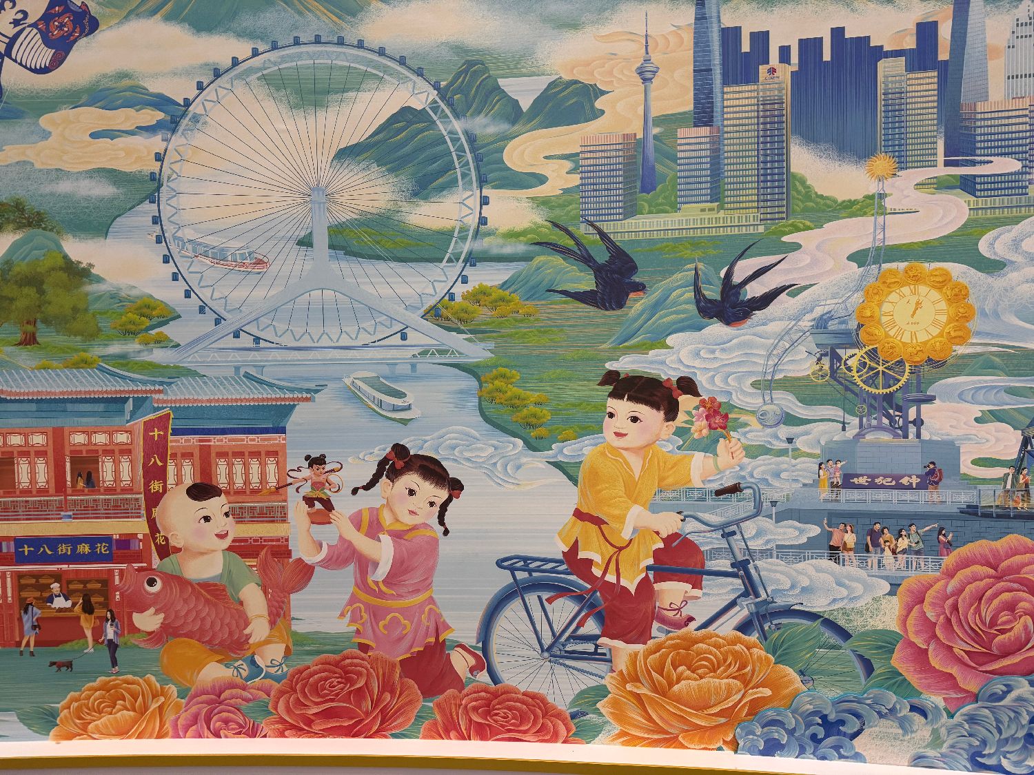 在新闻中心一幅墙绘中,杨柳青木版年画中的经典年画娃娃托举着天津泥人张泥塑哪吒,他们一起走在海河边,向中外来客展示着古老天津的包容底色。