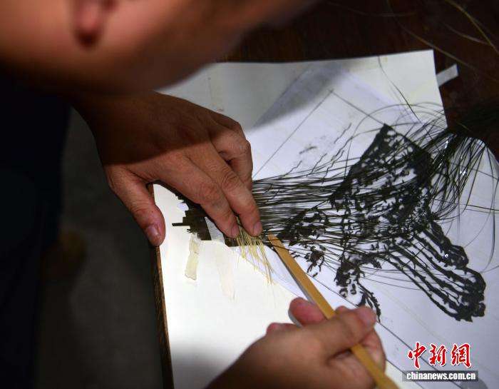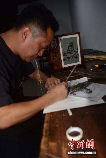 9月2日,谢宏星正在制作竹编画。