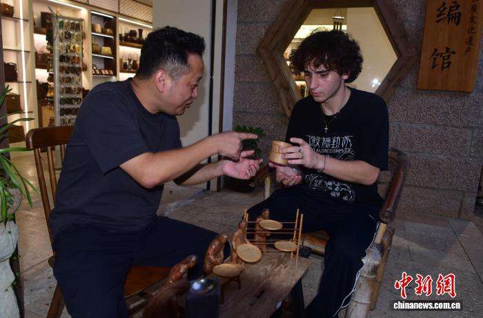 9月2日,游客观看竹编作品。