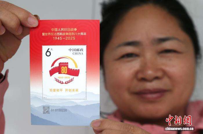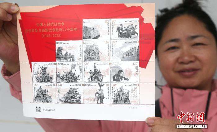 9月3日,在青海格尔木,集邮爱好者展示《中国人民抗日战争暨世界反法西斯战争胜利八十周年》纪念邮票。(图片来源:本文图片均据中新网)