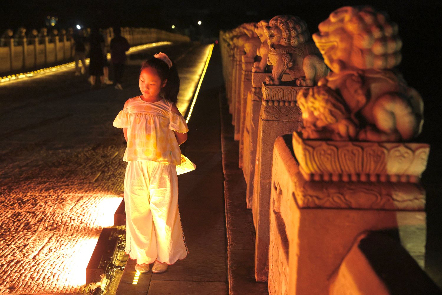 9月3日晚,小朋友在亮灯后的卢沟桥参观。