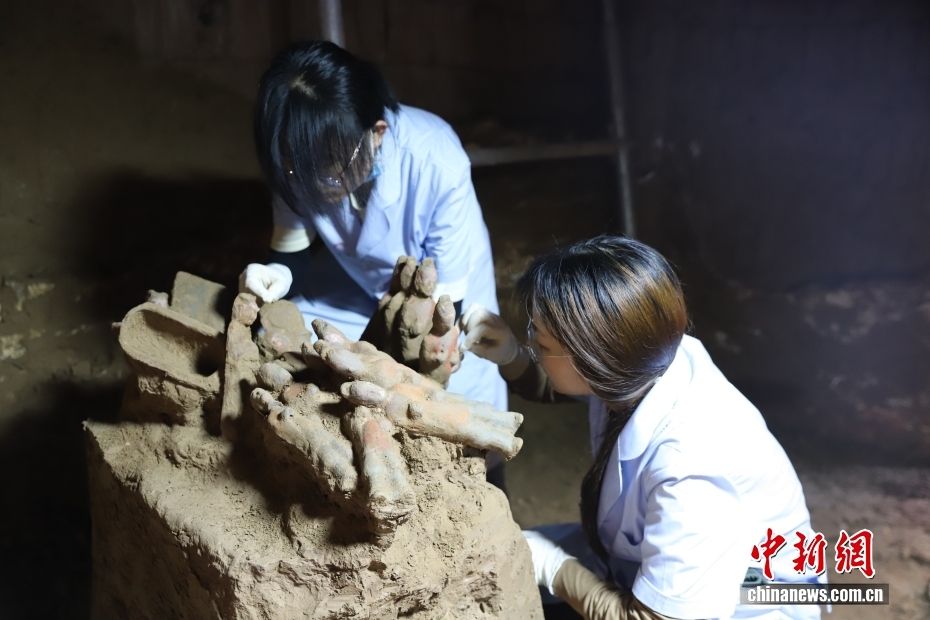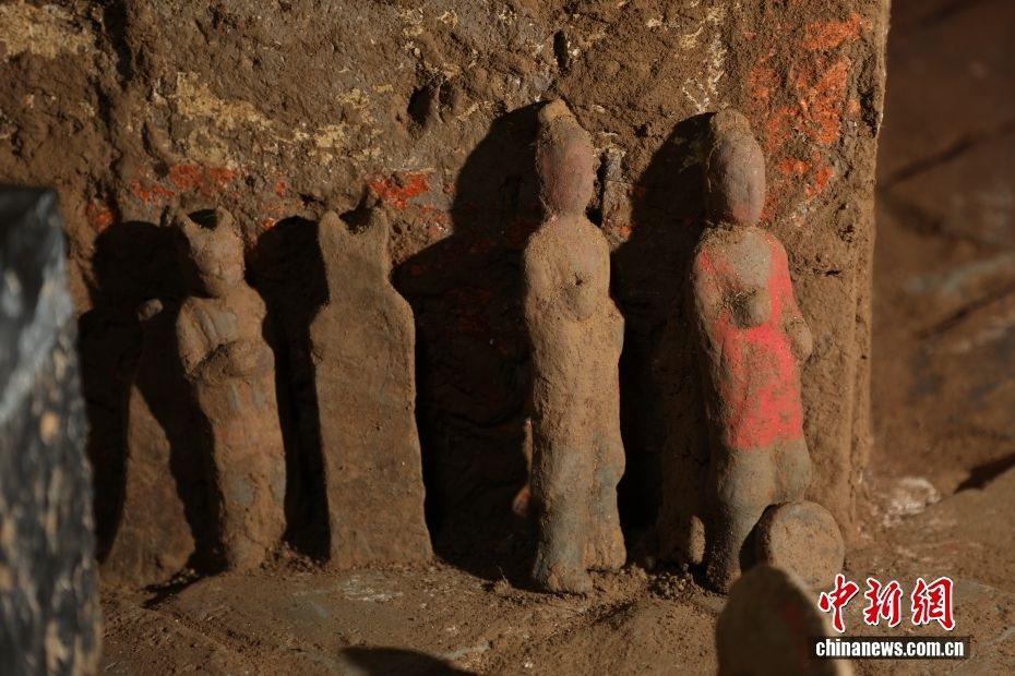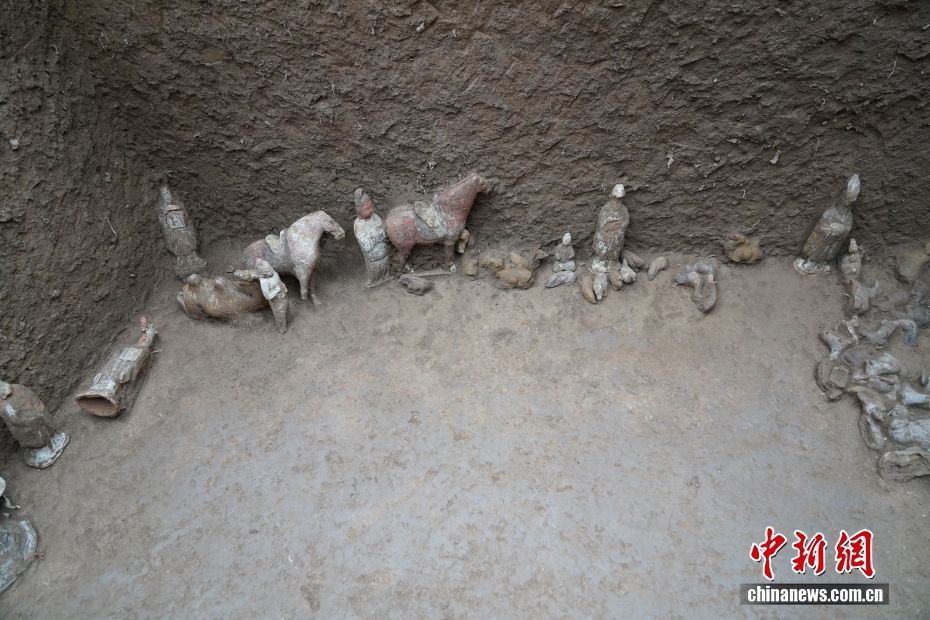 2023年4至8月,该院在咸阳市泾阳县高庄镇马家堡村北发掘了北魏孙定仁墓。墓形制保存较好、出土器物丰富、志文内容详实,是西安周边近年来发现的规格较高的北魏纪年纪名墓。志文内容显示墓主孙定仁,为北魏豳州刺史,曾参与了北魏末期镇压河北起义和关陇起义的重大事件。图为2023年8月6日拍摄的墓室南壁出土陶俑。(图片来源:本文图片均自中新网)