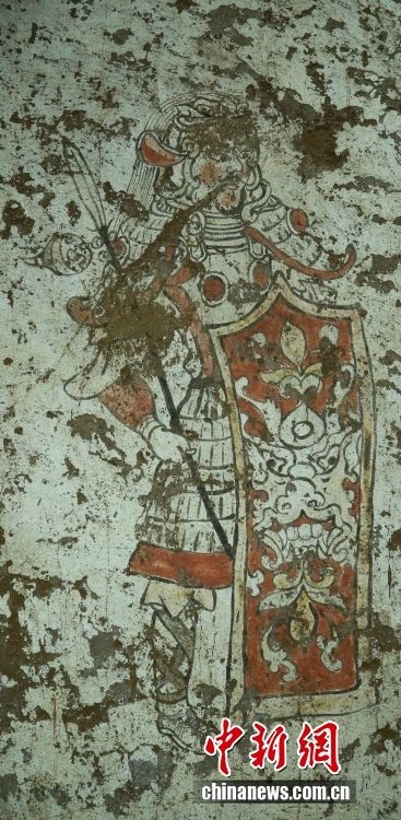 2022年8月,陕西省考古研究院在咸阳市陶家村西北发掘了一处隋唐时期家族墓地。墓葬为“隋尚书右仆射、兵部尚书、左候卫大将军、光禄大夫、北平襄侯”段文振墓。已发现段文振和其夫人以及子辈、重孙等墓葬7座,惜均遭严重盗扰。段文振墓墓道两壁、过洞正面及天井下两壁均绘有壁画,其中墓室四壁壁画保存较好。段文振墓形制完整,遗物丰富,壁画精美,应为咸阳原上已发掘的最高等级隋墓。图为2022年7月5日拍摄的持盾武士图。