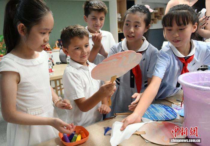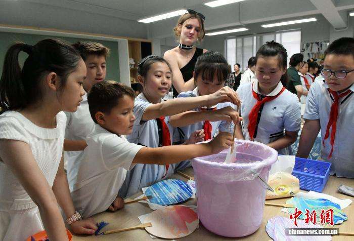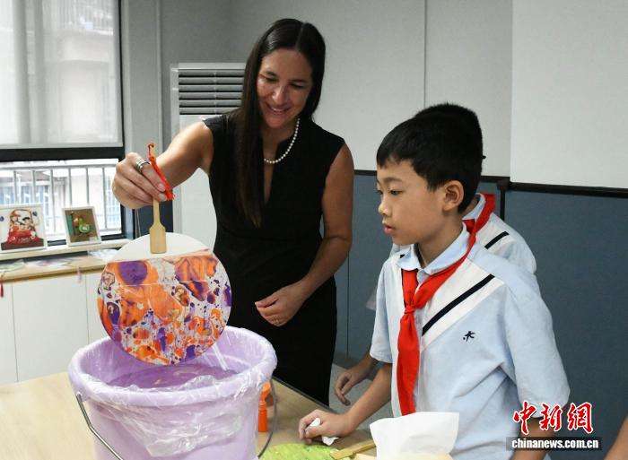 史迪威将军外曾孙女南希·米尔沃德(左一)在重庆大田湾小学体验制作漆扇。