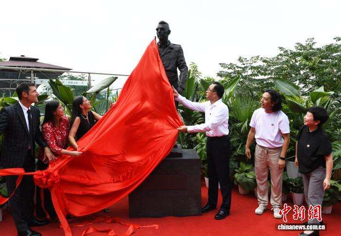 史迪威将军外曾孙女南希·米尔沃德(左三)、苏珊·科尔(左二)和史迪威将军外曾孙丹尼斯·考克斯(左一)等人为史迪威将军雕像揭幕。