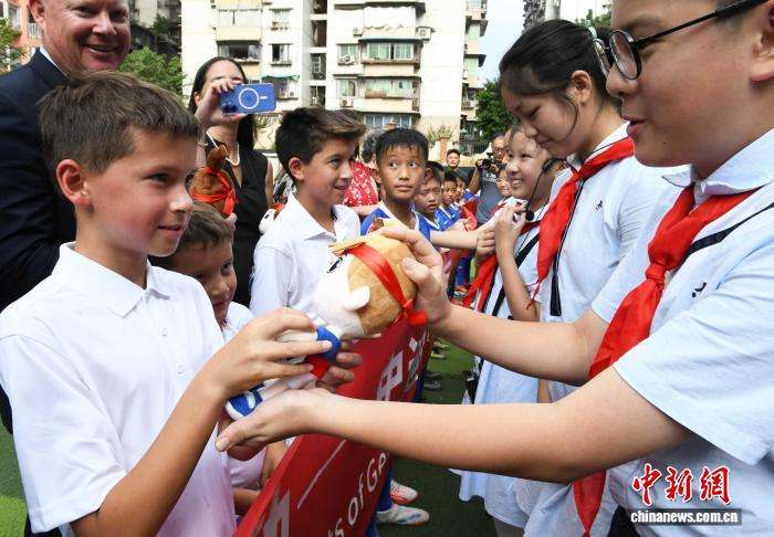重庆大田湾小学学生向史迪威将军家族第五代成员威廉·米尔沃德(左一)赠送礼物。