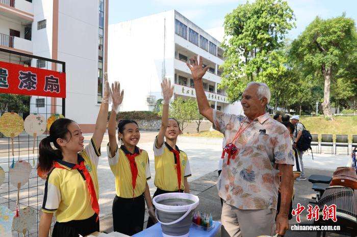 飞虎队后裔与柳州学生互动,体验中国传统漆扇制作。