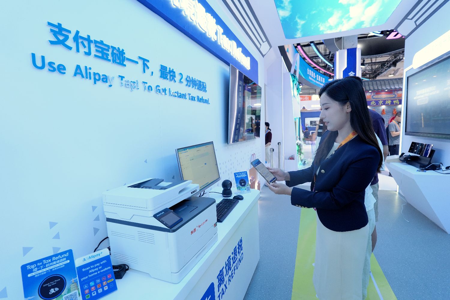 9月9日,北京首钢园区,一名媒体记者在2025年服贸会中国移动展台体验离境退税服务。