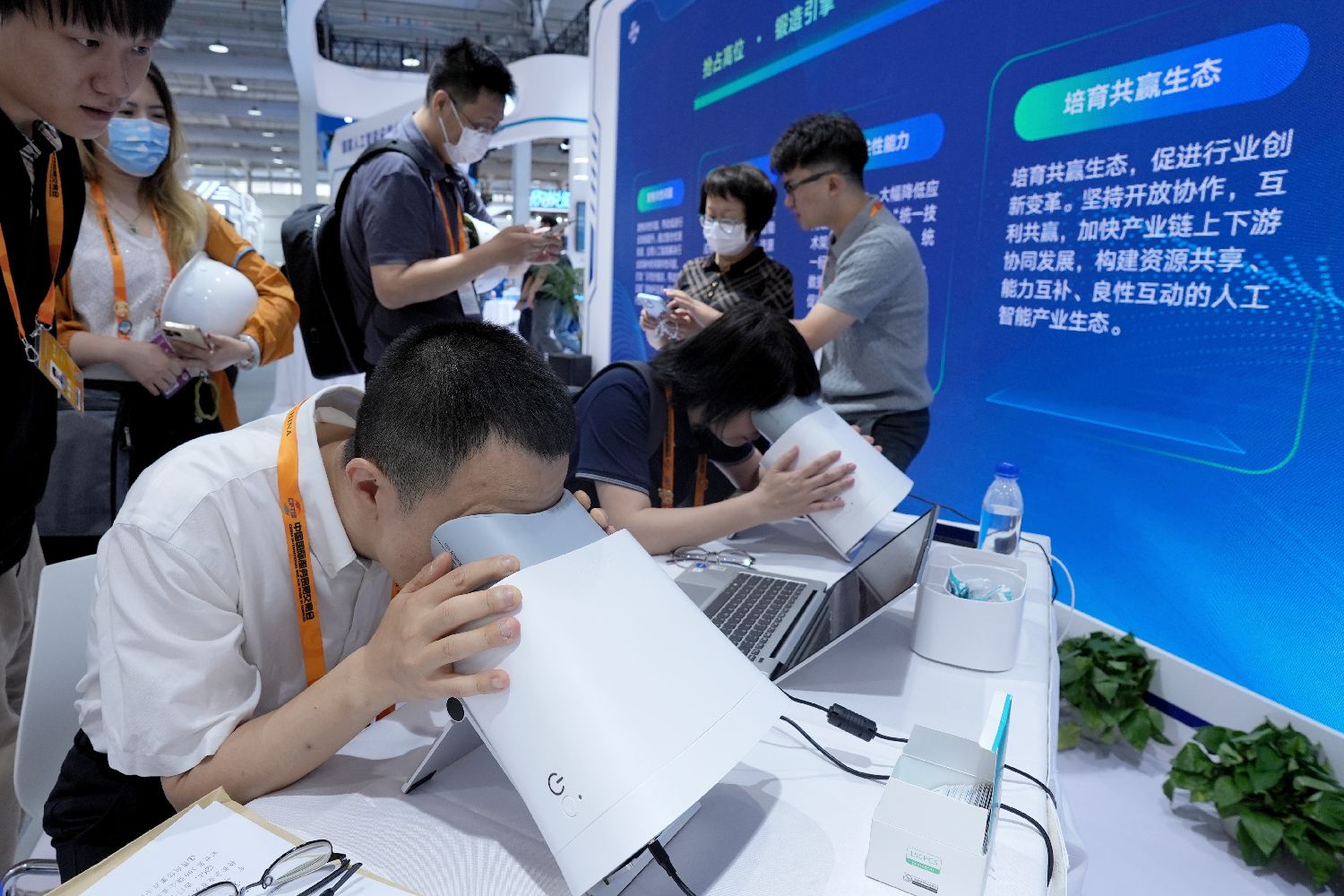 9月9日,北京首钢园区,媒体记者在2025年服贸会健康卫生服务专题展体验一款AI眼底相机,该款相机可通过拍照分析心脑血管等风险。