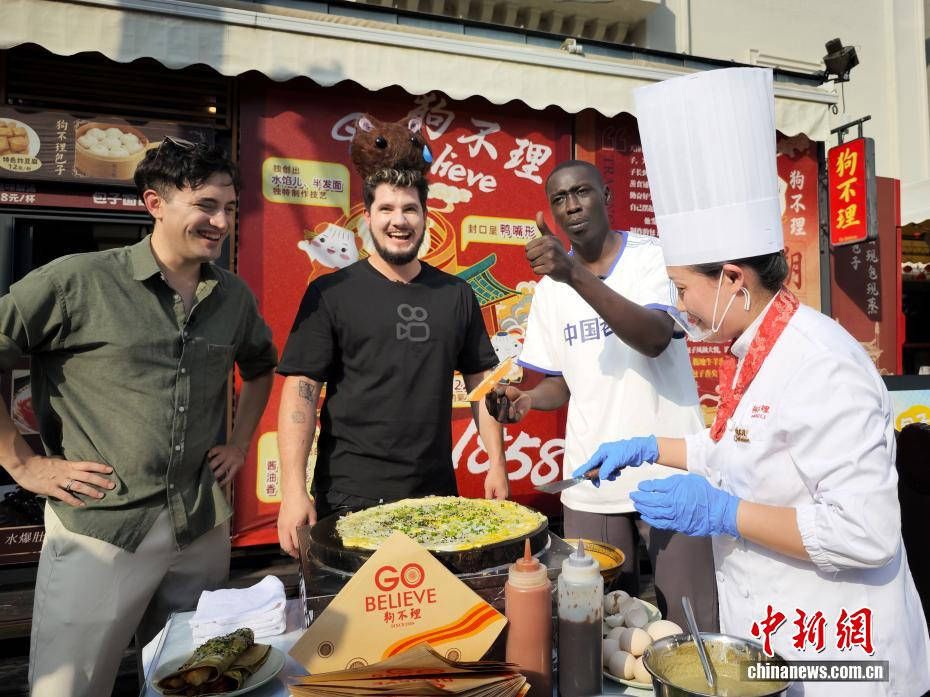 9月10日,天津意风区,“无语哥”(右二)体验摊煎饼果子。