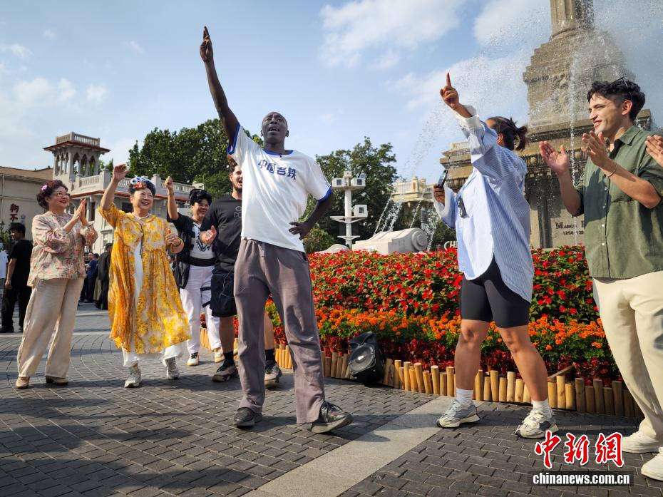 9月10日,天津意风区,“无语哥”(左五)与市民互动跳舞。
