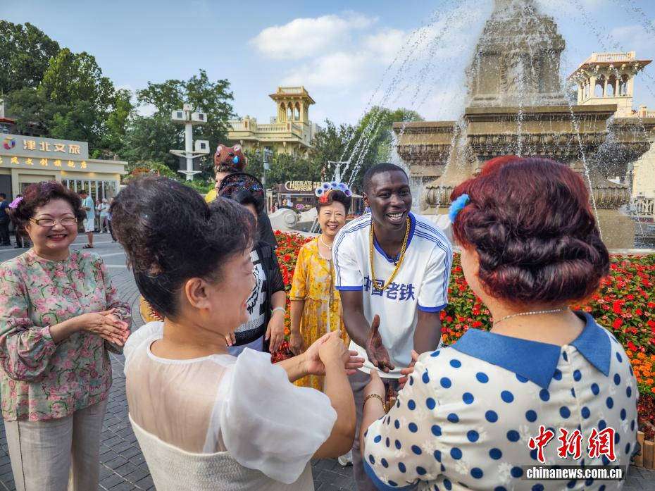 9月10日,天津意风区,“无语哥”(右二)与市民互动。