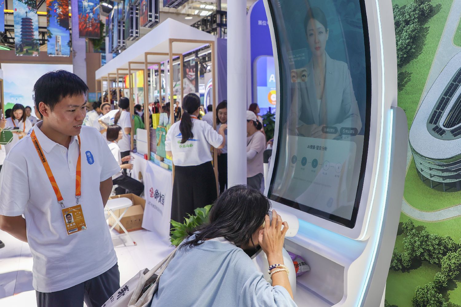 9月11日,参观者在怀柔区展团体验中医数智化四诊仪。(图片来源:中新社)