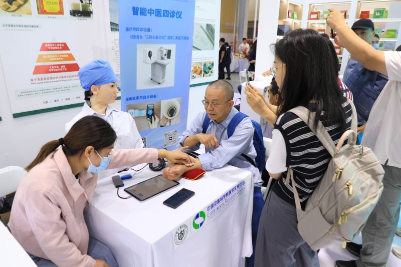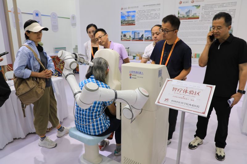 2025年9月12日,中国中医科学院展台,参观者体验三部九候康养机器人。据介绍,该机器人是一款在中医药理论指导下结合智能成像分析技术、中医脉诊大数据分析技术的康养机器人。主要面向养老、康养、药食同源、保健产品等大健康领域机构。