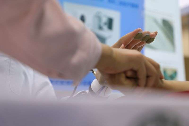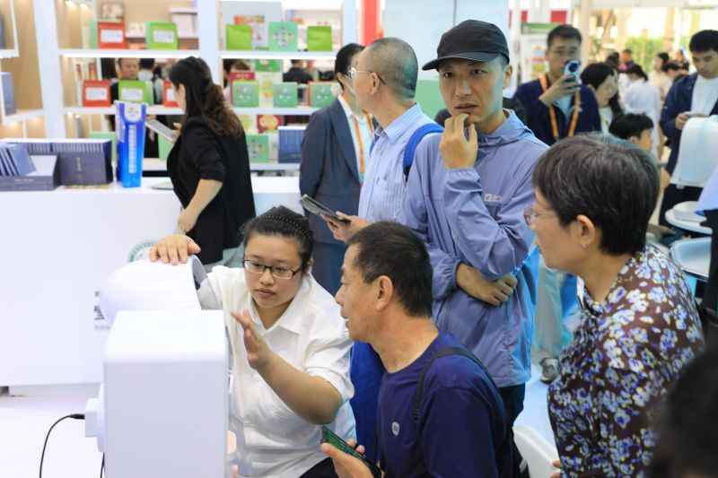 2025年9月12日,工作人员指导体验者使用仿真四诊AI机器人号脉。