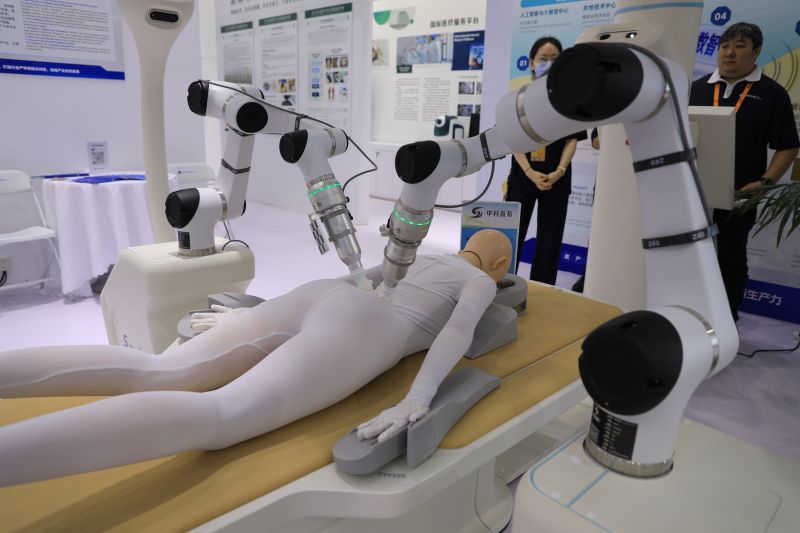 在中科尚易的展台,一台AI循经调理机器人正在为体验者进行背部按摩。该公司工作人员刘会亮向记者介绍称:“我们的机器人基于大数据分析和视觉巡航,针对不同体型的患者计算出穴位的精确位置,仿生机械臂沿着人体经络走位,结合高频激振、恒温热场和磁疗三种方式,真正实现经络疏通。”