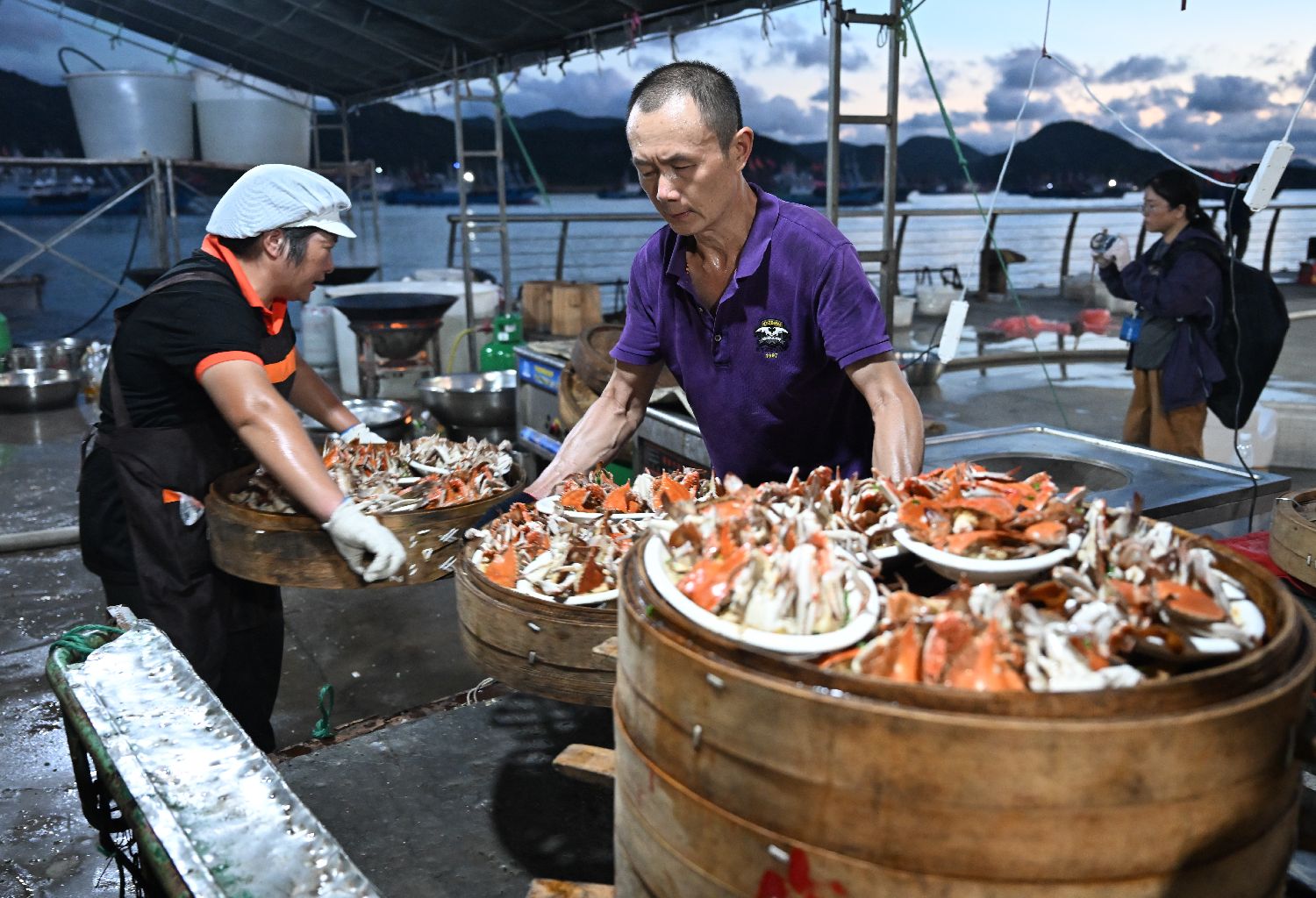 9月15日,工作人员将清蒸螃蟹搬上运输车。