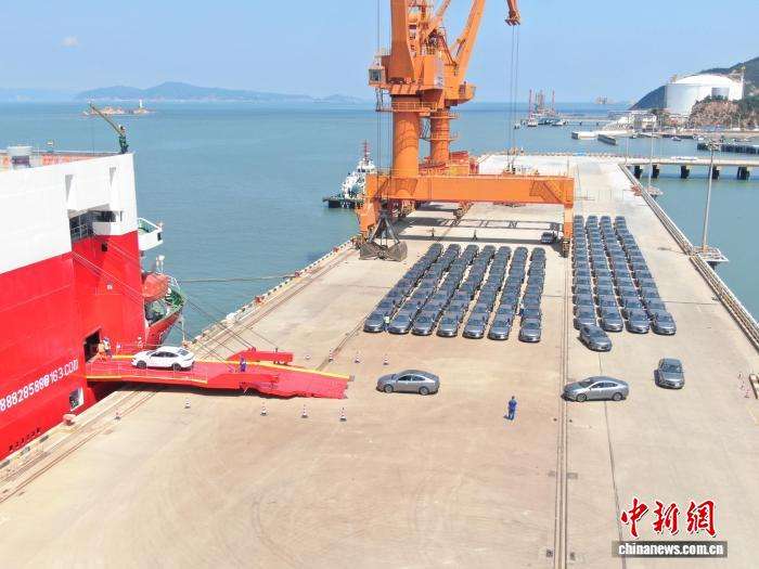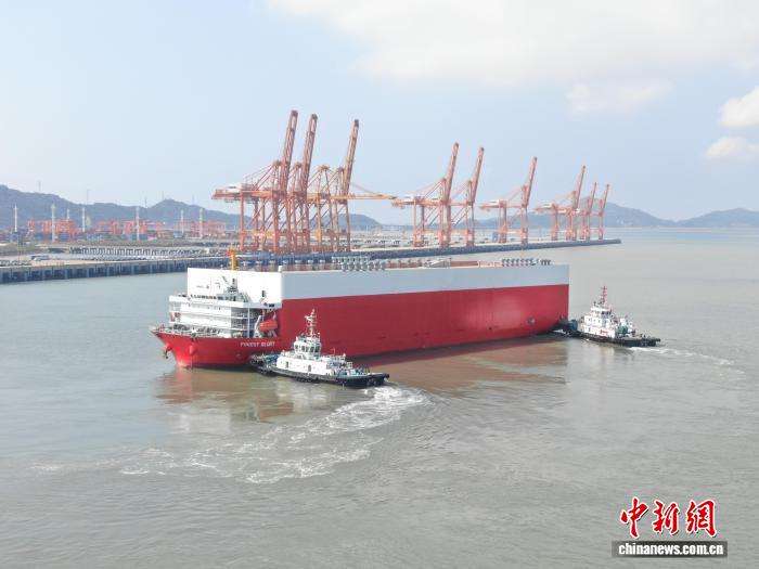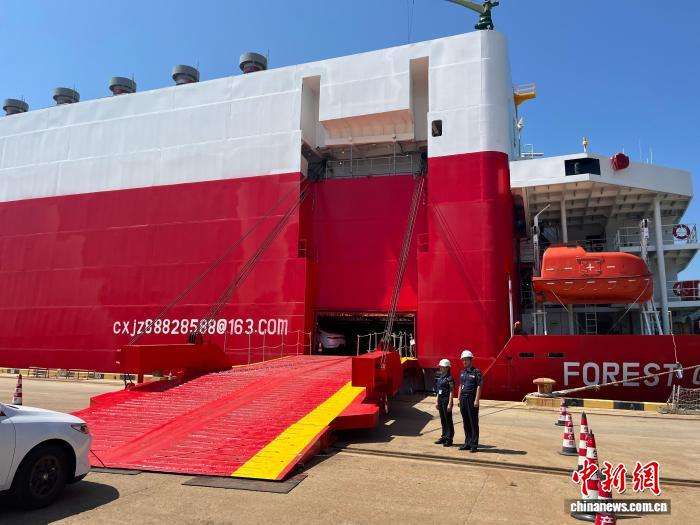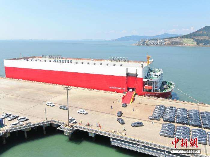 这标志着温州至中东海上新航线正式开通,也是温州港建港以来首次开通用于新能源汽车整车滚装出运的航线,为中国新能源汽车走向国际增添了一条物流通道。图为“森林荣耀”与停在港口的新能源汽车。(图片来源:本文图片均来自中新网)