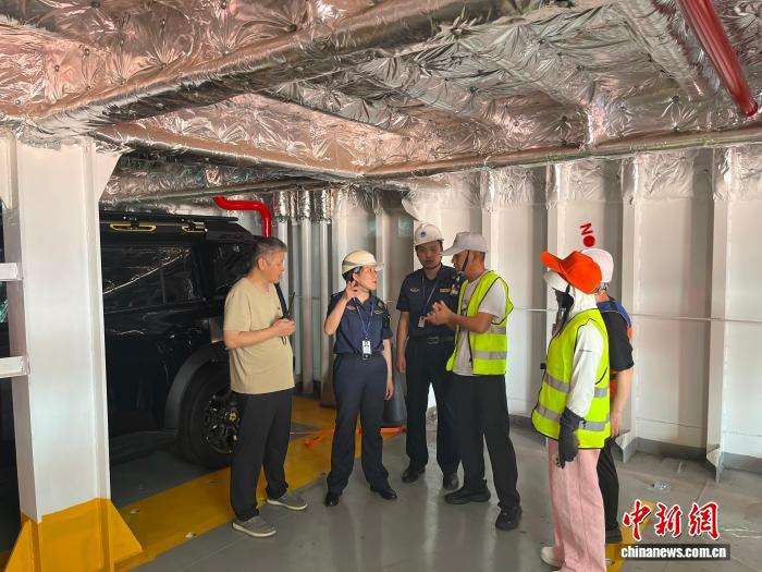 图为海事部门工作人员在现场进行保障工作。为保障航线顺利开通和滚装船首航成功,温州海事部门联合多家单位,制定“一船一策”保障方案,开辟24小时“优先查验”绿色通道,实施“远程预检+登轮检查”等,全方位保障船舶运输安全。