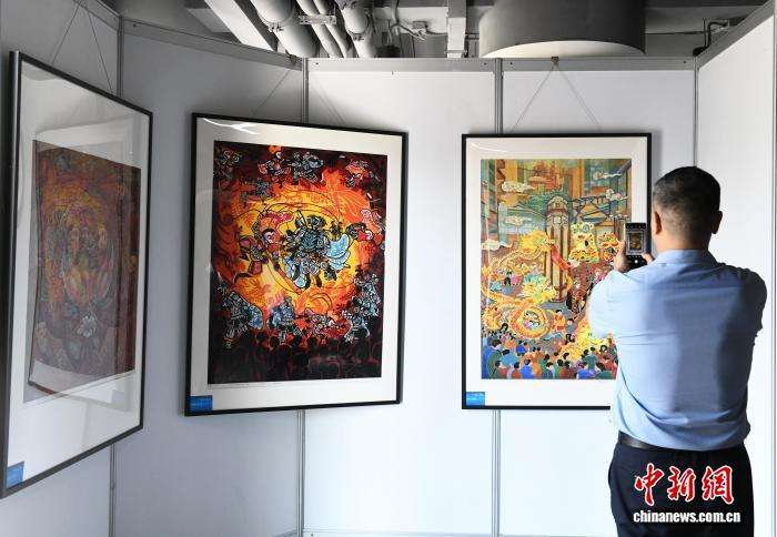 图为展览现场的綦江农民版画吸引嘉宾驻足参观拍照。(图片来源:本文图片均来自中新网)