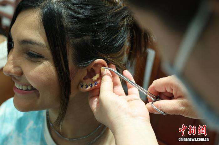 图为拉美网络博主体验中医特色疗法耳豆压穴。