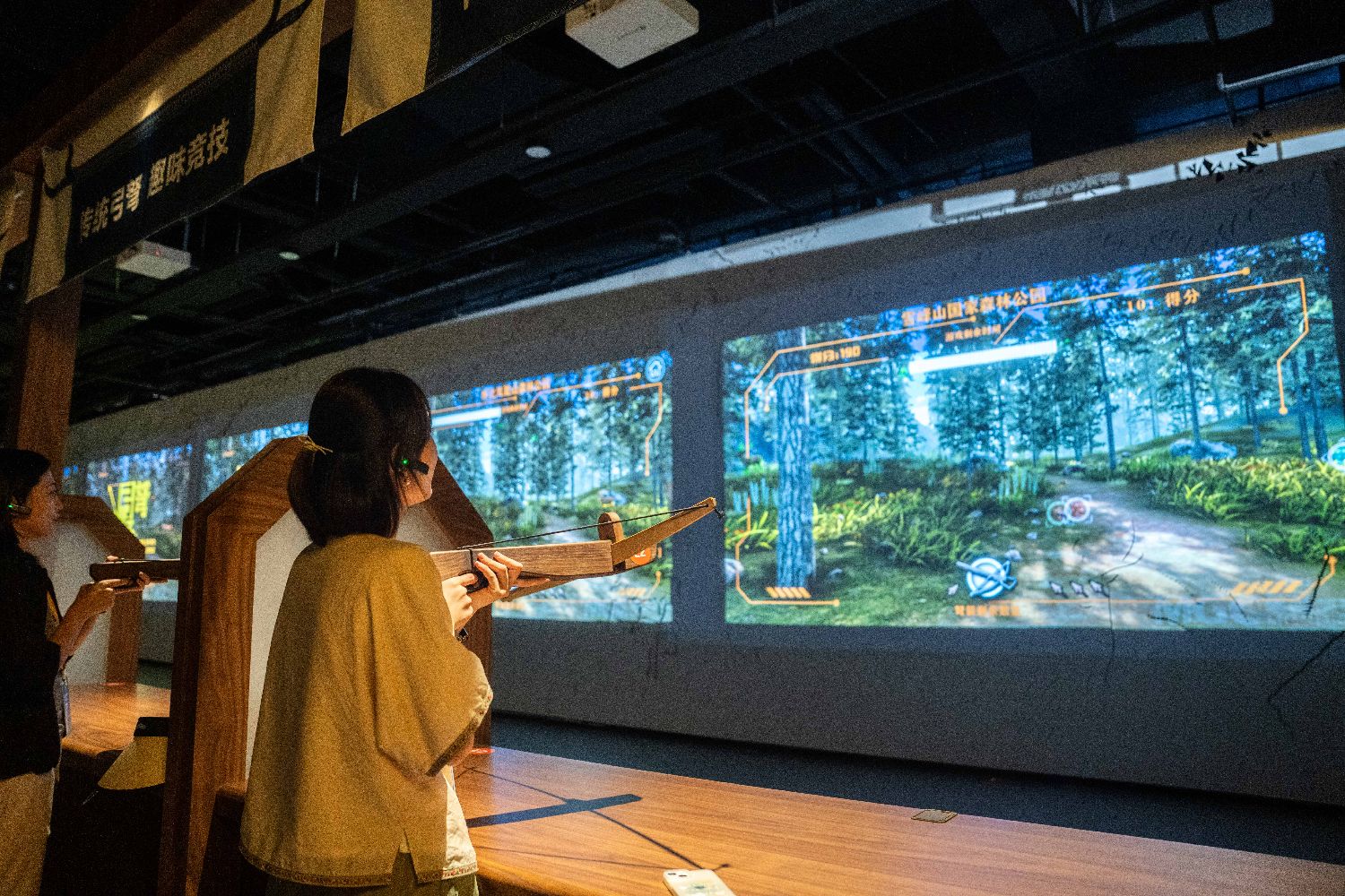 目前,怀化以五溪非遗园为抓手,探索非遗保护传承新模式。推出非遗主题研学项目、开发深度互动项目,构筑特色文化产业体系,吸引更多人了解、学习非遗,让传统技艺成为城市发展的文化动力。图为9月16日,在湖南省怀化市五溪非遗园,游客在体验数字化弓弩。(图片来源:本文图片均据新华社)