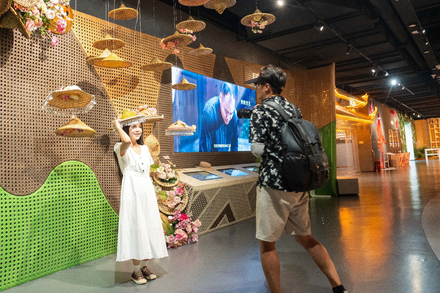 9月16日,在湖南省怀化市五溪非遗园,游客(左)在试戴黔阳竹艺编制的帽子。