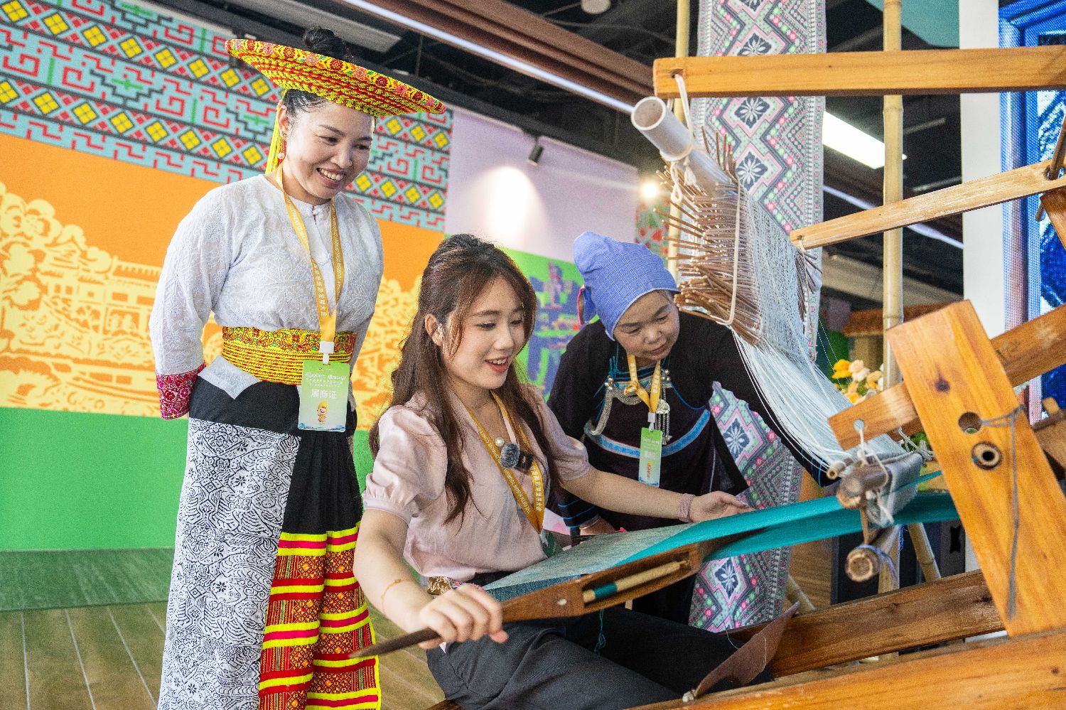9月16日,在湖南省怀化市五溪非遗园,游客在体验侗族织锦技艺。