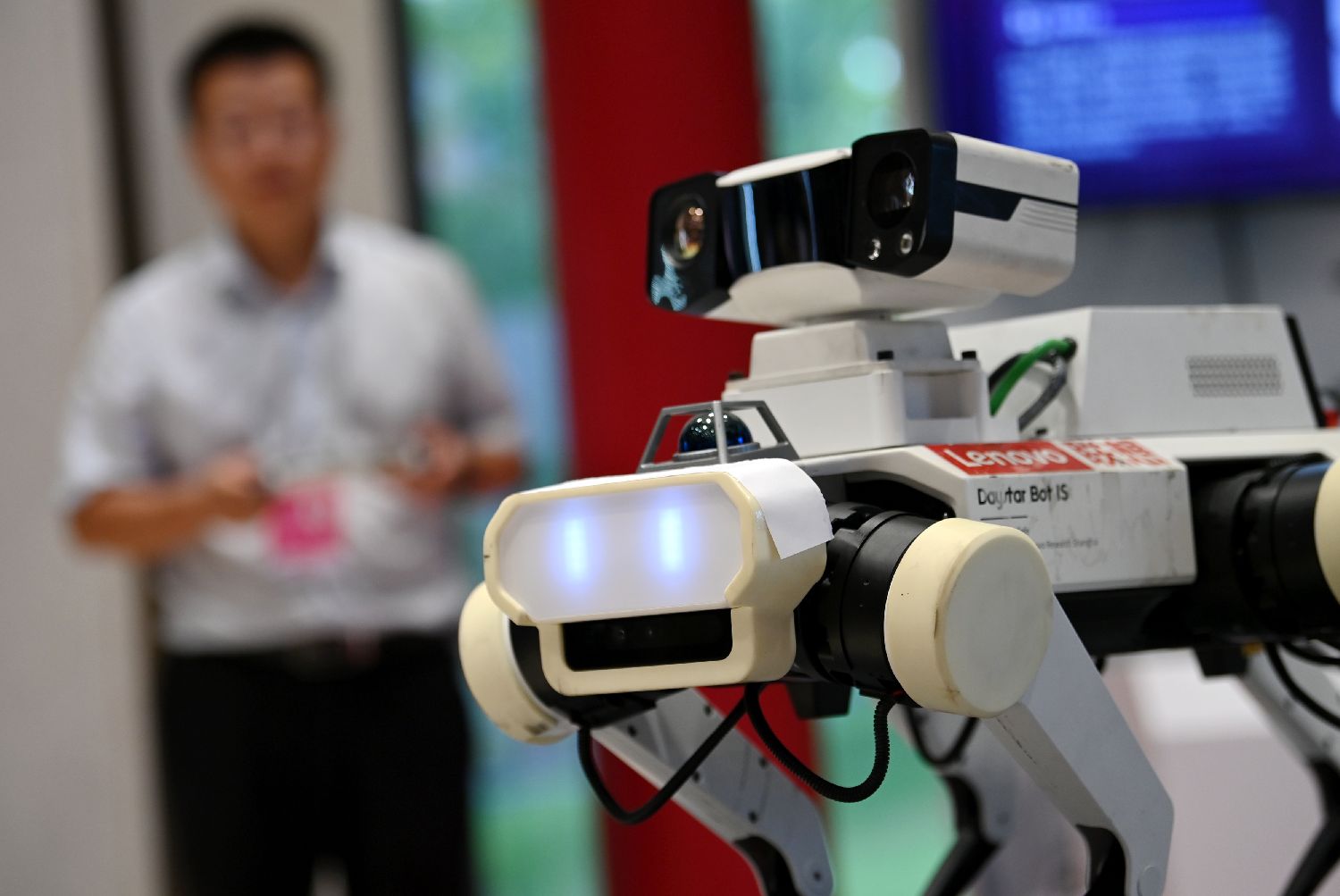 9月17日,工作人员在论坛的文化遗产数字化精品项目展上操作展示应用于应县木塔数字化保护项目的联想晨星六足机器狗。