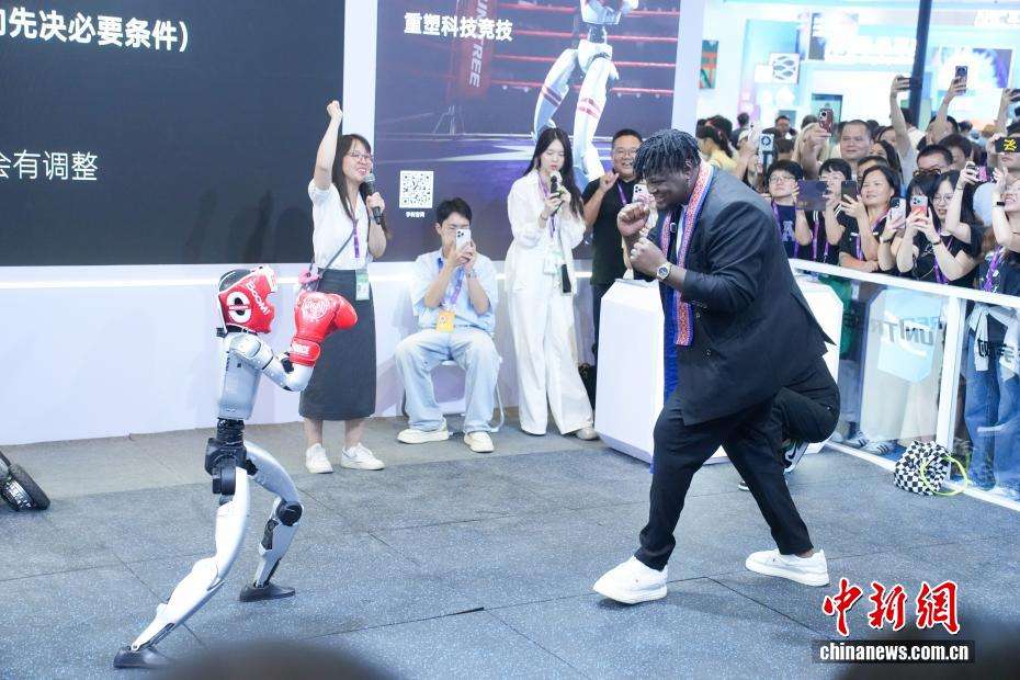 图为尼日利亚网络达人博密与宇树机器人进行“拳击比赛”吸引不少参观者。