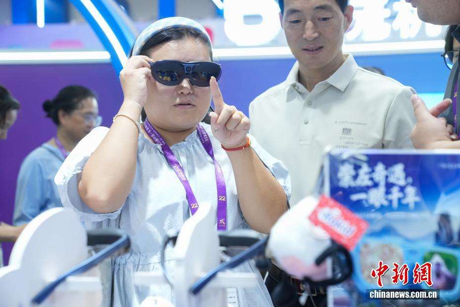 图为参会者佩戴增强现实(AR)眼镜领略广西崇左风光。