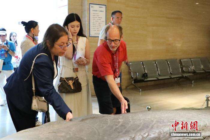 外国专家在重庆白鹤梁水下博物馆触摸石鱼浮雕。
