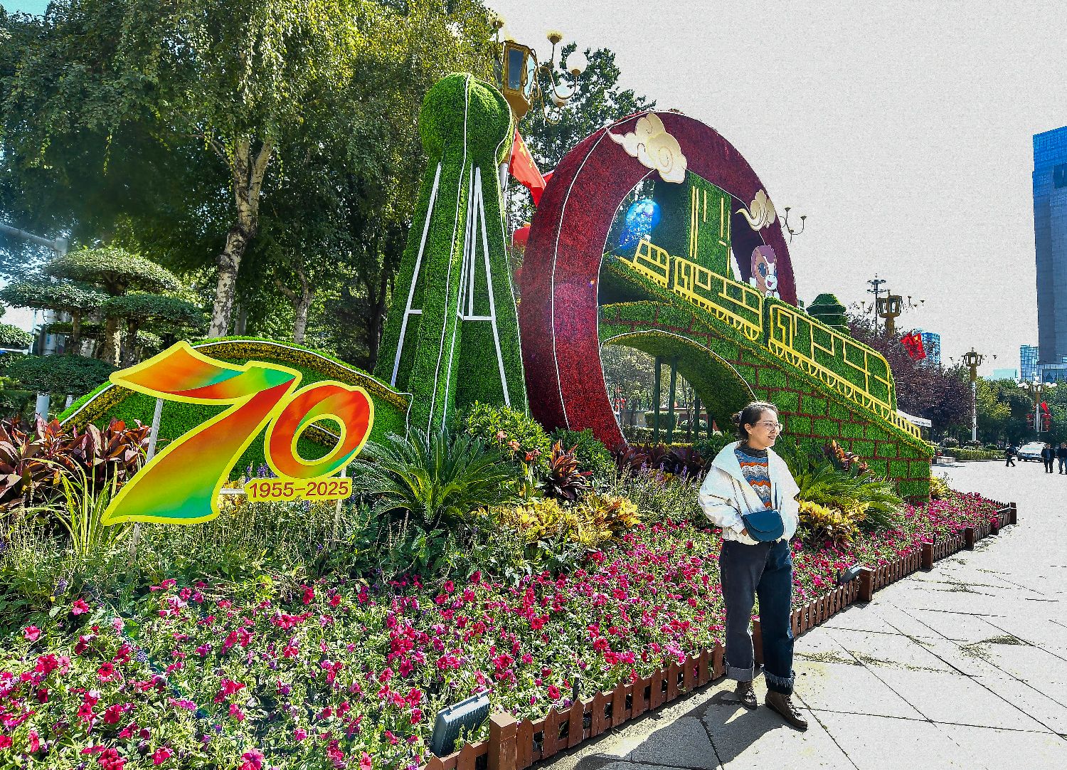 为庆祝新疆维吾尔自治区成立70周年,乌鲁木齐多处重要路段设置园林景观和宣传牌,营造喜庆祥和的氛围。