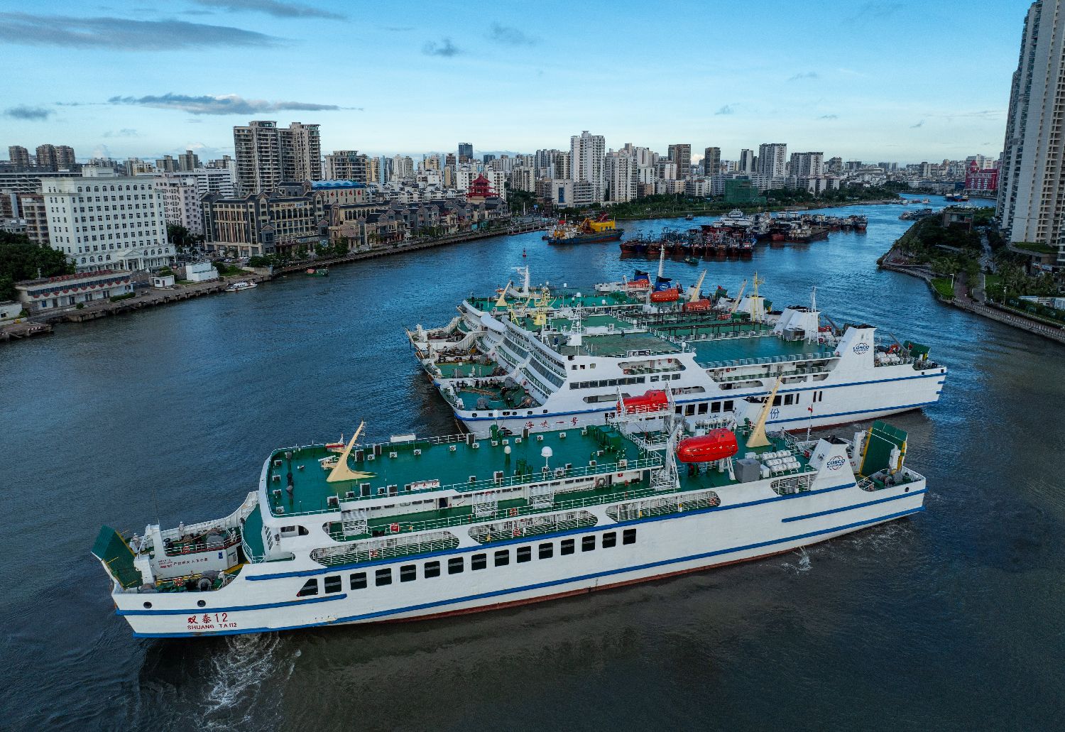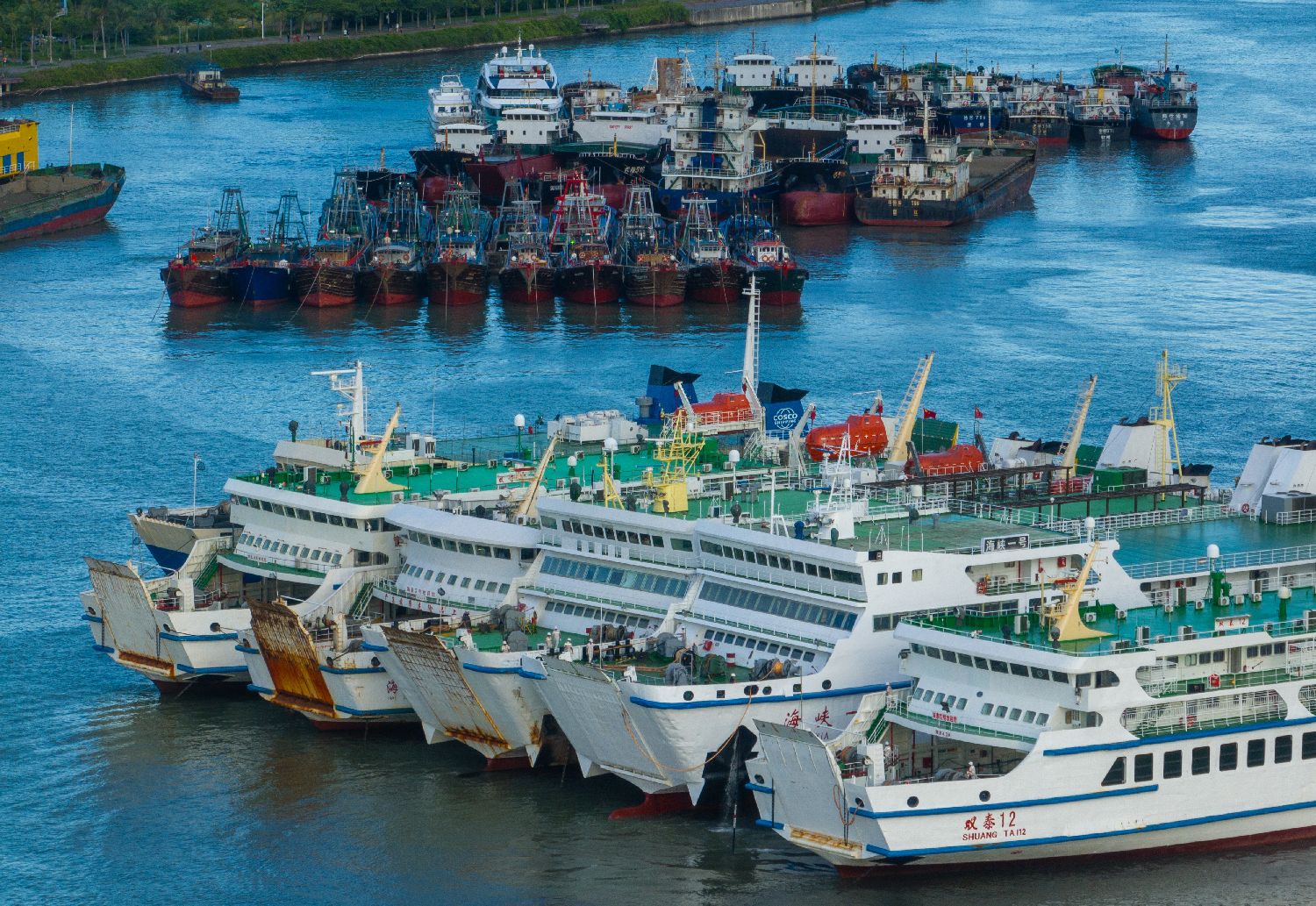 9月22日,在海南海口,一艘客滚船进入海甸河泊位回港避风。(图片来源:中新社)