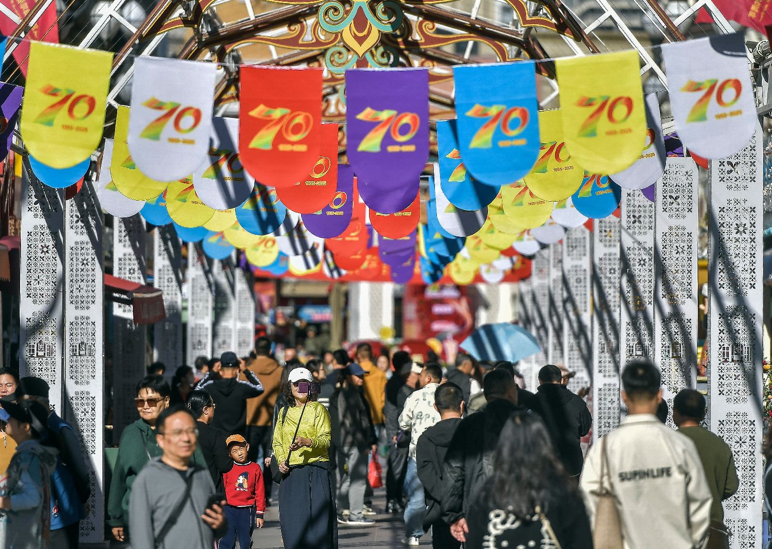 9月22日,在新疆乌鲁木齐市大巴扎步行街,游客从悬挂的庆祝新疆维吾尔自治区成立70周年彩旗下走过。(图片来源:中新社)