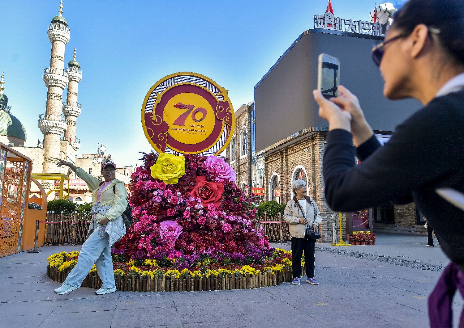 9月22日,在新疆乌鲁木齐市大巴扎步行街,游客在刚刚摆设的花堆前拍照留念。(图片来源:中新社)