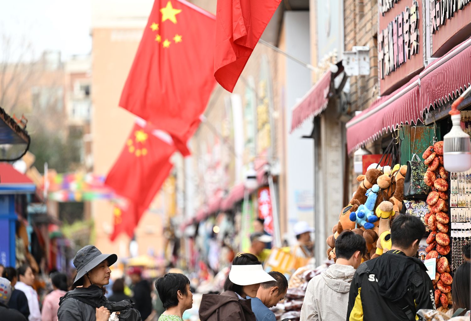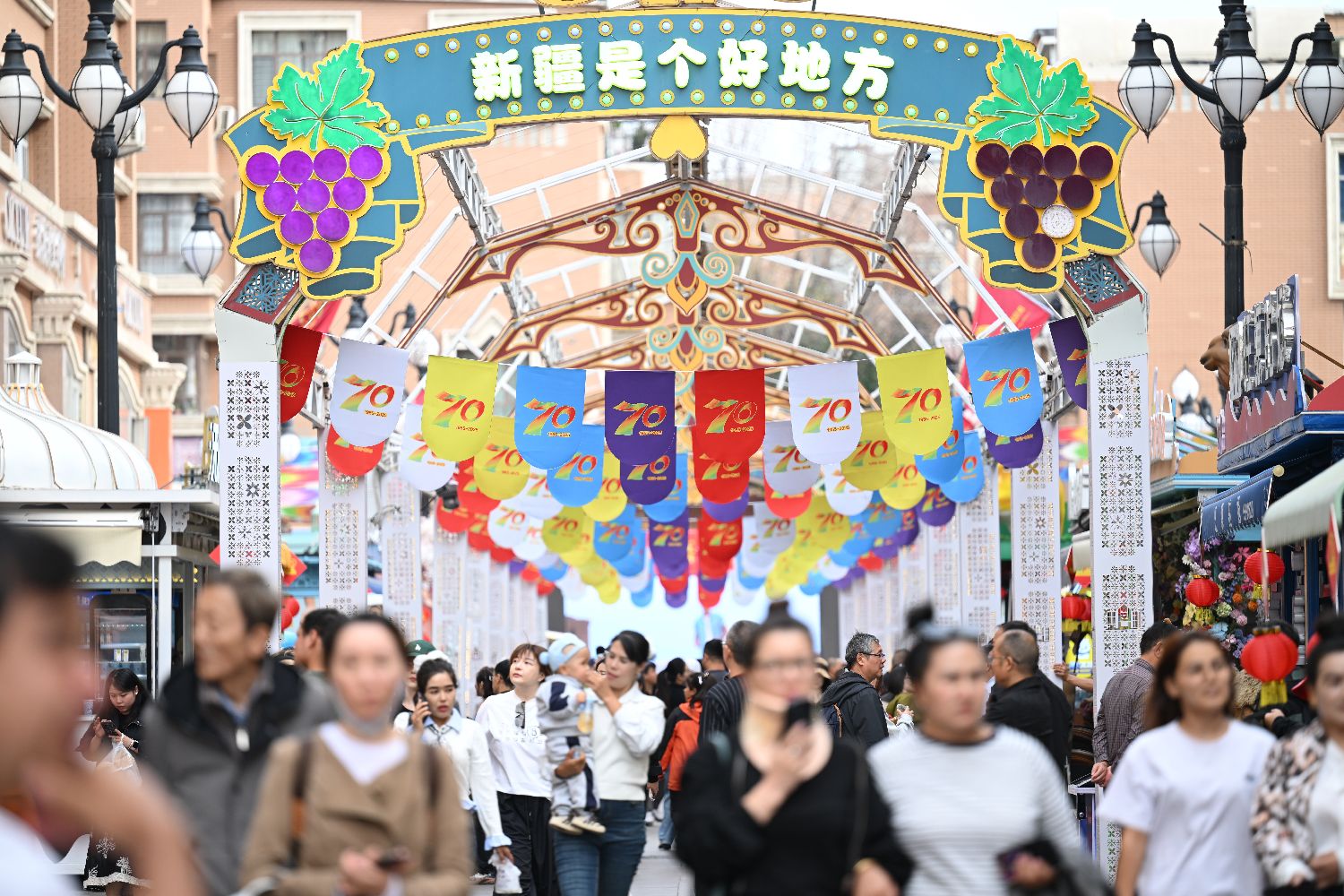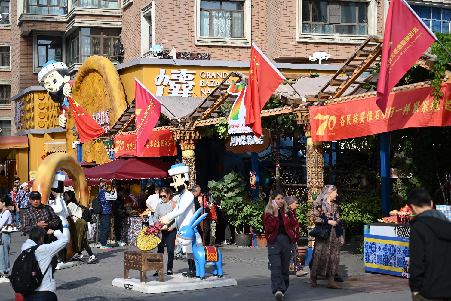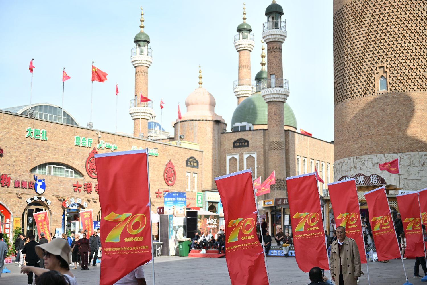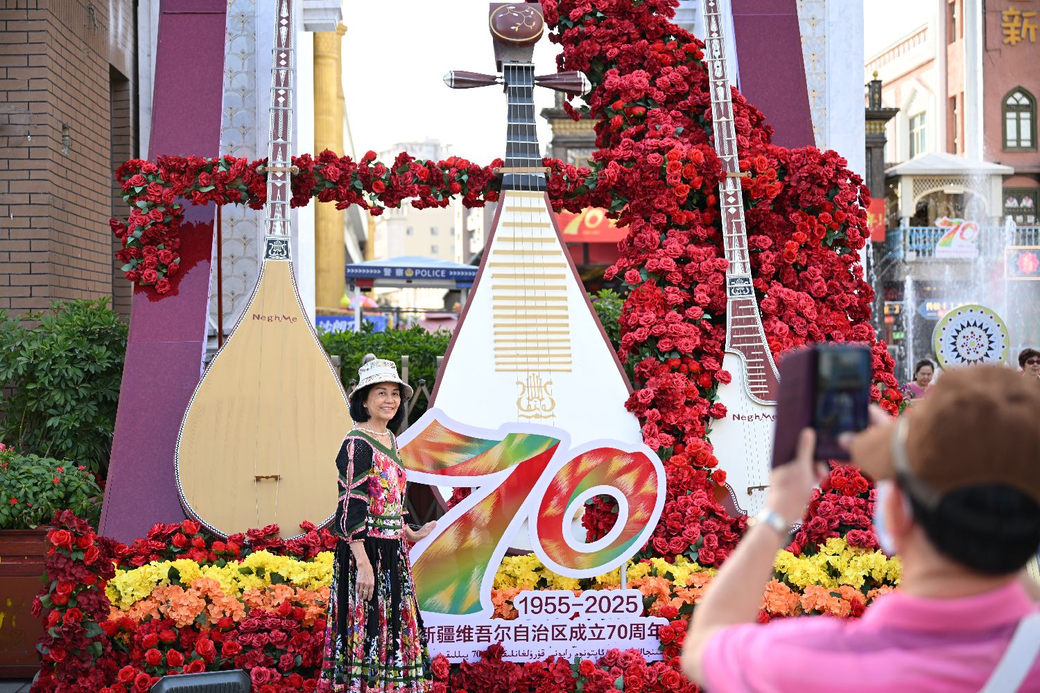 9月23日,游客在新疆乌鲁木齐市大巴扎步行街游览、拍照。为庆祝新疆维吾尔自治区成立70周年,乌鲁木齐多处摆设花堆和宣传牌等,街头洋溢着喜庆祥和的氛围。