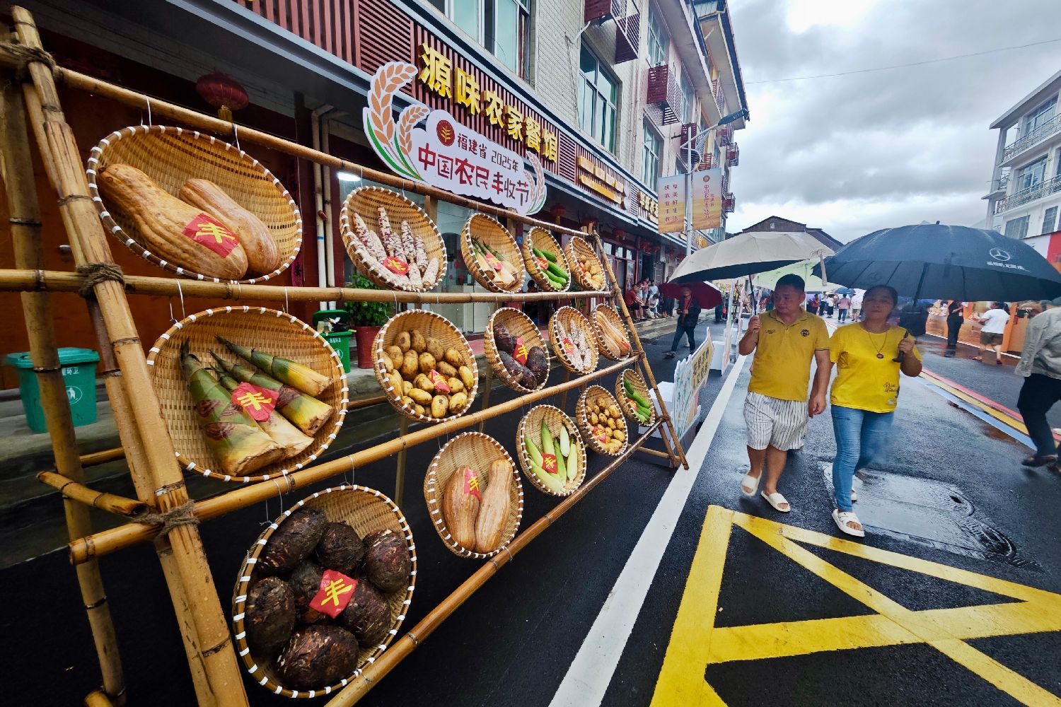 9月23日,在仙游县菜溪乡象星村,游客观看丰收节农产品展示。