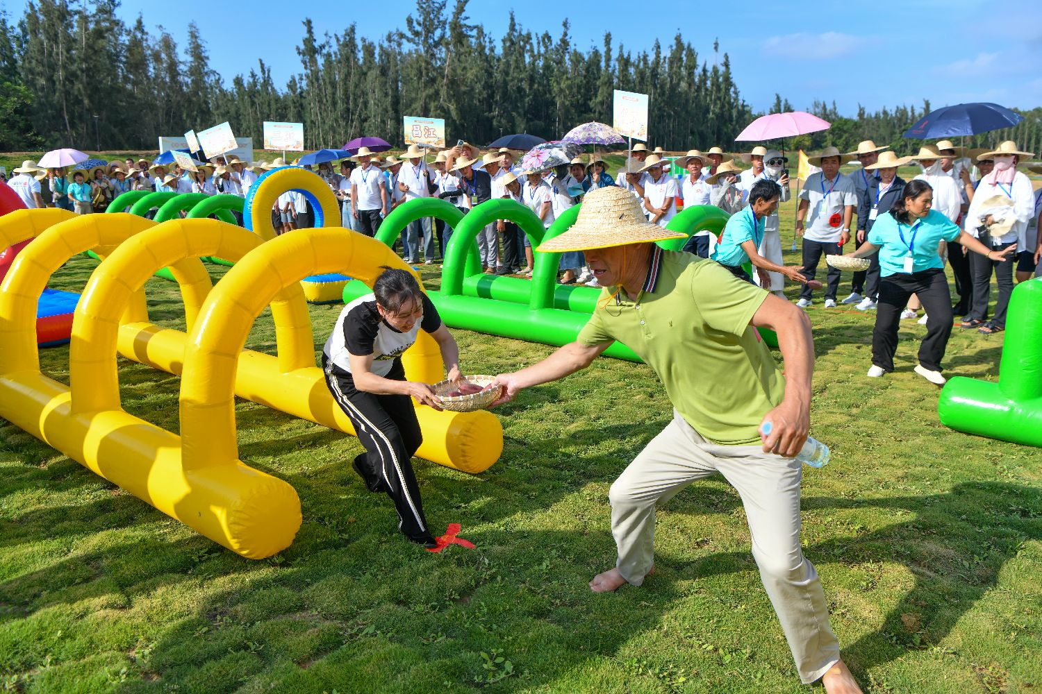 9月23日,一场特色农民趣味运动会在海南儋州举行。抓儋州鸡、抢红鱼干、地瓜障碍接力赛等项目趣味十足。海南各市县农民积极参赛,在欢乐赛事中尽享丰收喜悦。图为参赛者进行“海头地瓜障碍接力赛”比赛。