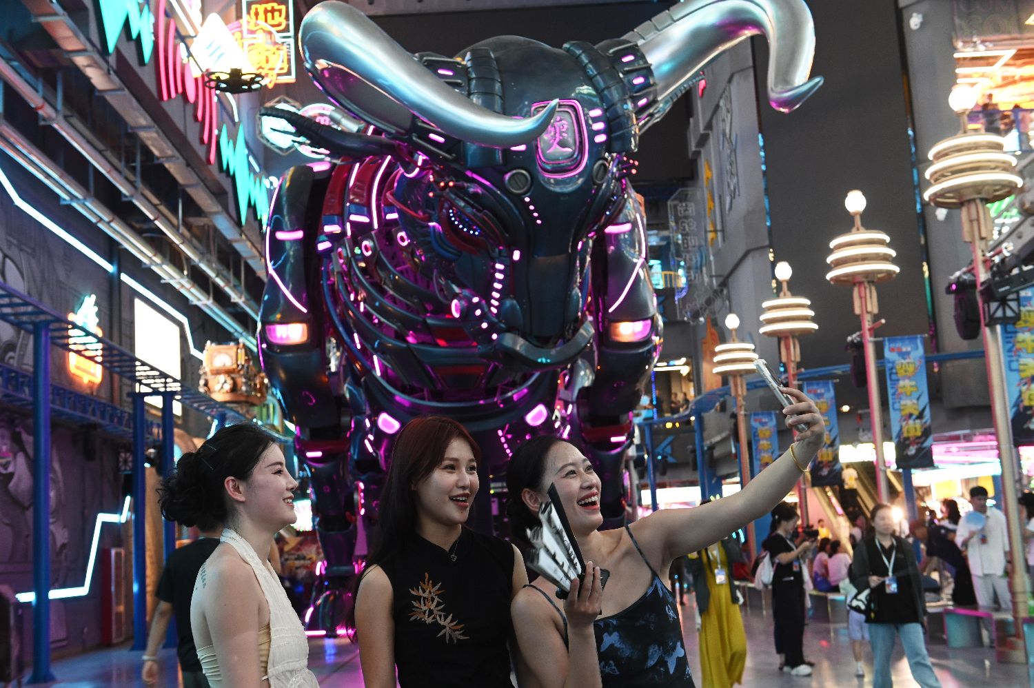 “这款仿生机械巨兽就是夔牛‘雷雷’,重达43吨,站立时高13米,长21米。”刘文静介绍,夔牛天街以《山海经》中夔牛为IP形象,将神话想象转化为可触摸的科技景观,每天分时段上演互动秀和“夔牛大秀”,这个赛博机械巨兽一问世,就受到游客的热情追捧。