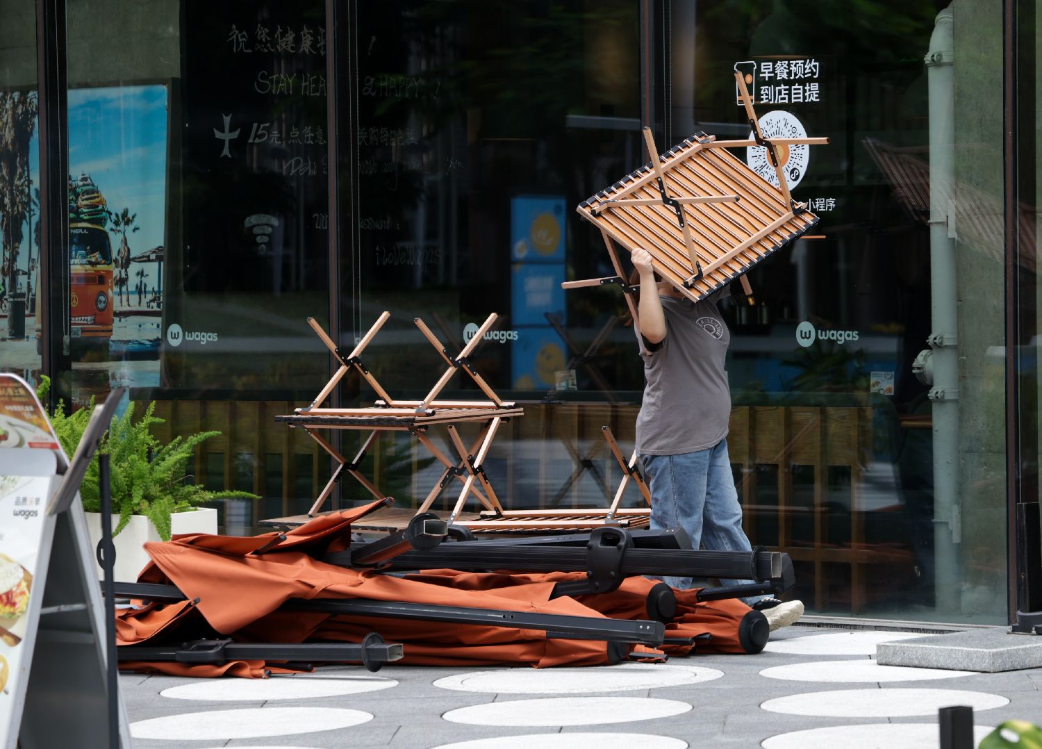 9月23日,在深圳市福田区一处商场,临街餐馆的服务员收拾室外桌椅设施。
