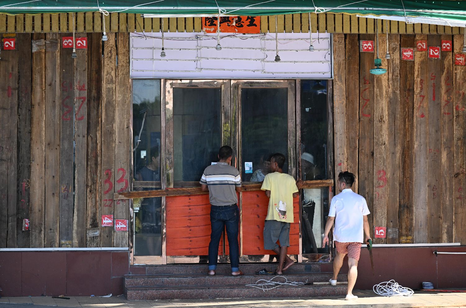 9月23日,在广东阳江市海陵岛的一处饭店,工作人员在安装防风木板。