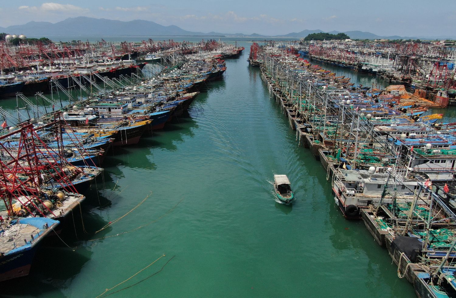 9月23日,在广东阳江市海陵岛闸坡国家中心渔港,小船在接送渔民靠岸。