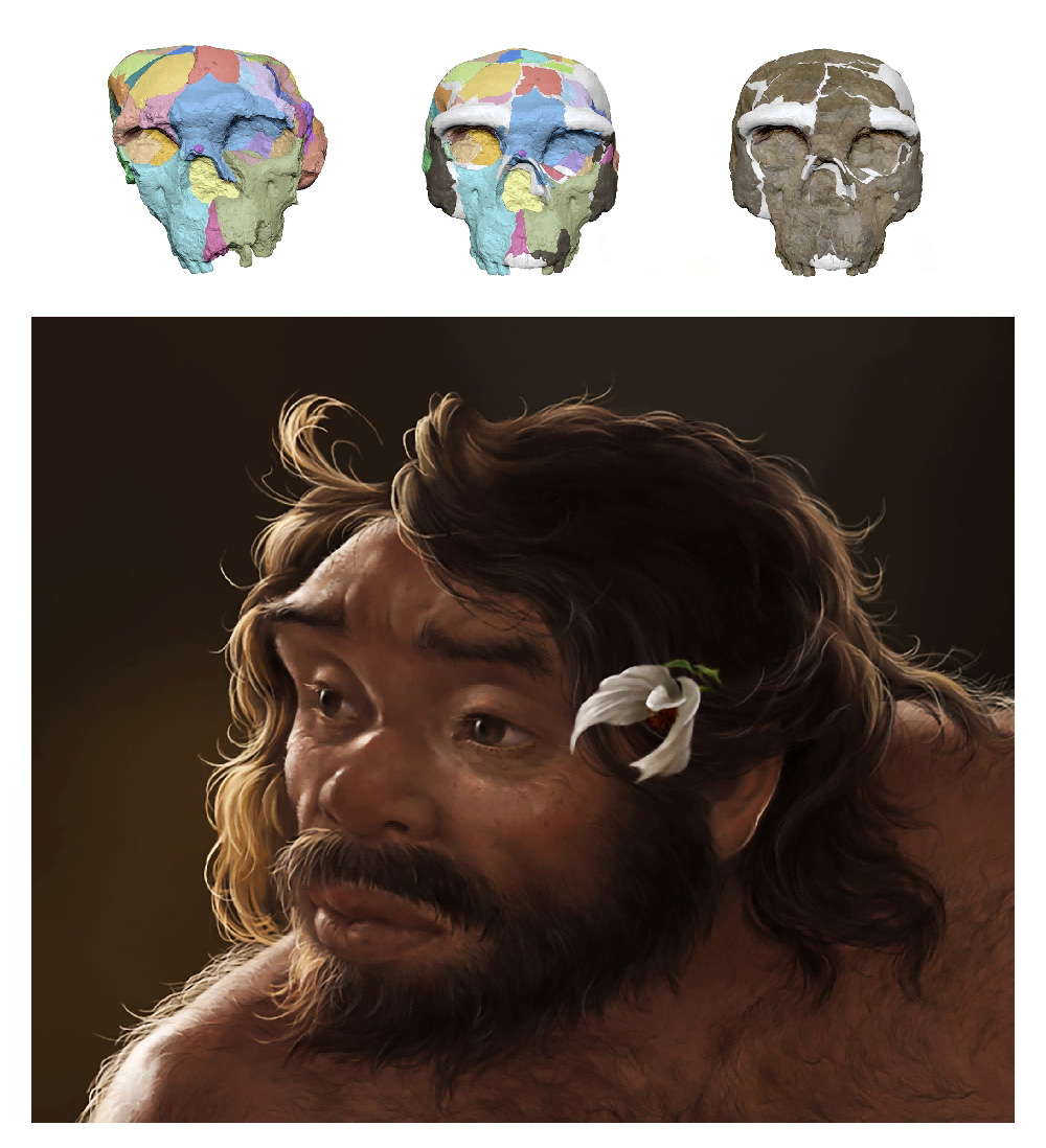 本项研究的人属系统演化树,右下为郧县人复原图。