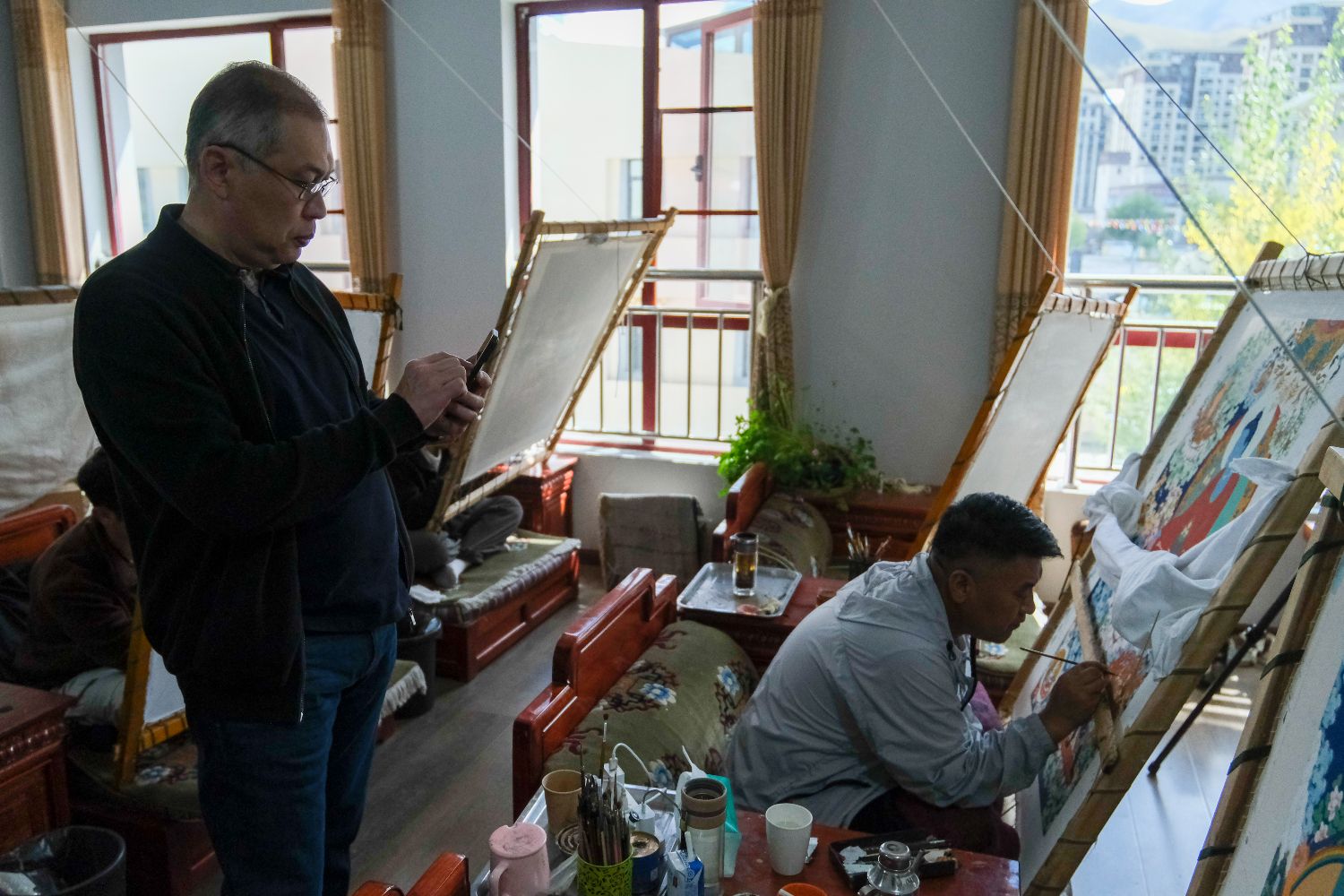 9月26日,哈萨克斯坦驻华大使努雷舍夫在西藏唐卡画院观看了解唐卡绘制过程。(图片来源:中新社)