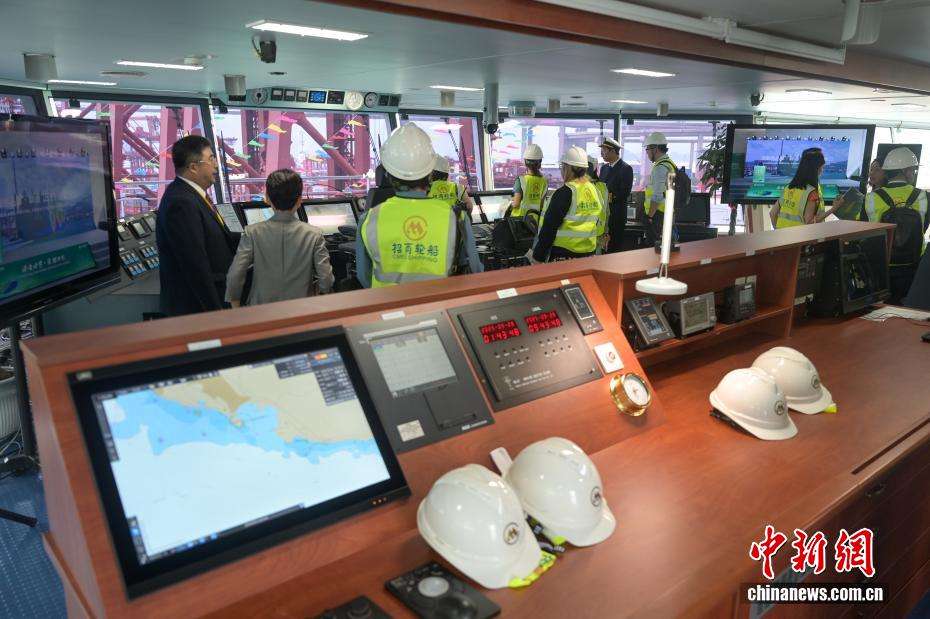 动力系统支持燃油与甲醇灵活切换,使用绿色甲醇时可减排超70%。“港荣”轮首航执行中国至欧洲航线,在香港卸车后将驶往欧洲。图为“港荣”轮驾驶室。(图片来源:本文图片均来自中新网)