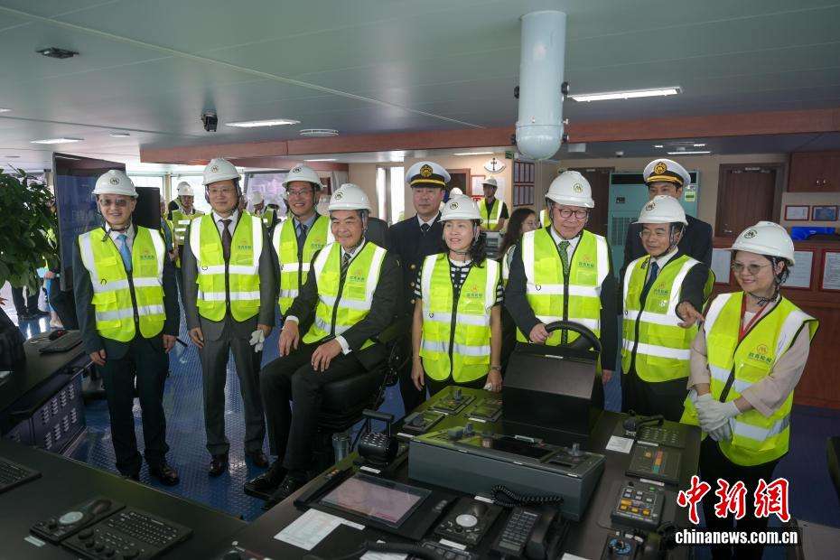 图为中国全国政协副主席梁振英(前排左四)、香港特区政府政务司司长陈国基(前排右三)等嘉宾登船参观驾驶台。