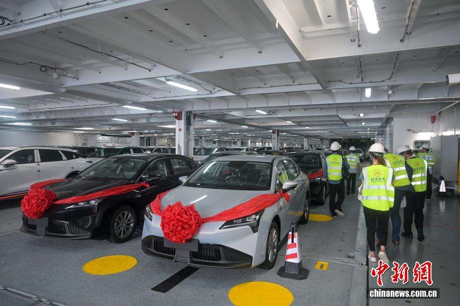 图为“港荣”轮内停放的汽车。