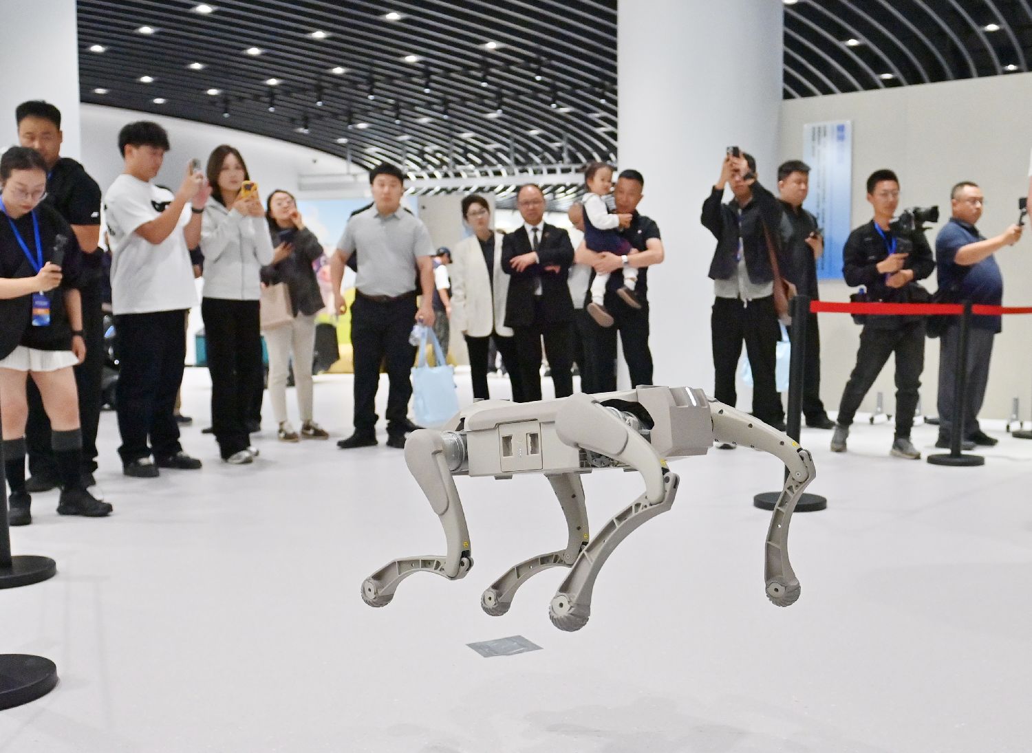 9月30日,吉林省仿生机器人创新中心应用示范基地于吉林省长春市揭牌,全国首家“仿生机器人MALL”也在同期开幕。图为参观者观看机器狗跳跃。
